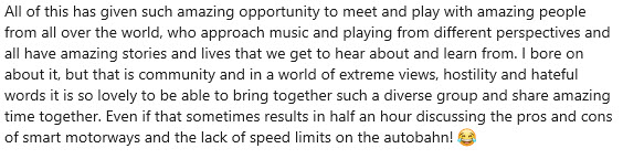 passion. Regardless of background or playing ability. It doesn't matter if it's your first time playing with others or not. We always come together for guitar! Here's a couple comments from our May 2025 WhatsApp Group...